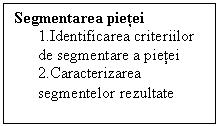 Activitatea de segmentare consta in analiza structurii, unei anumite piete din punct de vedere a unor criterii socio-demografice, in vederea identificarii existentei unor grupe de indivizi avand caracteristici diferite. Segmentarea in parte piata totala in grupe (segmente), asigurand o cat mai mare omogenitate in interiorul grupei si o mare eterogenitate intre grupe.