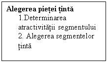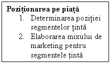 Segmentarea pietei, nu este decat primul pas pre o mai buna adaptare a intreprinderii la mediul economico-social. Ea este incadrata intr-un proces mai amplu, care include drept actiuni ulterioare celei de segmentare, alegerea pietei tinta iar apoi de pozitionare pe piata.