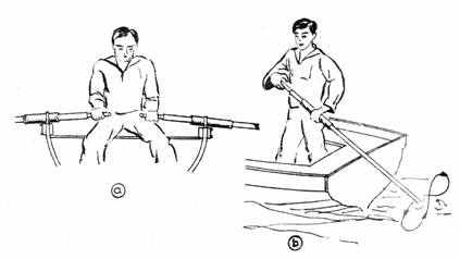 (6) Ramarea se incepe la comanda "Inainte !". Daca cele doua borduri trageau in sens invers, pentru ca ambele sa traga inainte se da comanda "Tribord (Babord) drepti !" apoi "Inainte peste tot !". Cand numai un bord trebuie sa traga se comanda "Tribord (Babord) drepti !". Ramarea inapoi se incepe la comenzile "Tribord (Babord) inapoi !", sau "Inapoi peste tot !". La comanda "Opriti !" ramele se baga in apa perpendicular pe suprafata apei. La comanda "Ramele in repaus !", ramelor li se da o miscare de alunecare spre interiorul ambarcatiunii si se sprijina manerul sub stringherul din bordul opus furchetului. La comanda "Las-sa mearga !" se da drumul manerului, rama alunecand de-a lungul copastiei cu pana spre pupa. Daca ramele nu sunt legate de furcheti, oameni lasa sa alunece ramele ca mai sus, tinand insa tot timpul mana pe maner. La comanda "Intrati ramele !" se apuca ramele ca si la armare, se scot din furcheti si se aseaza in ambarcatiune. Inceputul miscarii se va face de catre oamenii din prova.