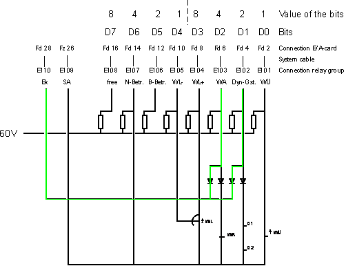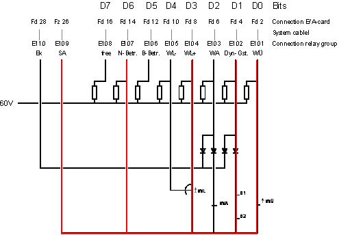 Prin intermediul contactelor releelor controlate - WL, WA, D1, D2, WU - tensiunea generata de placa I/O la iesirea conectorului Fz 26, este distribuita corespunzator la conectorii Fz 2, 4, 6, 8 ,10.