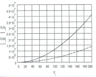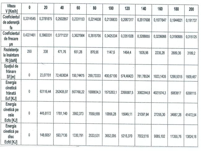 200 km/h, spatiul de franare Sf, energia cinetica Ecf a trenului respectiv, energia cinetica preluata de osie Ecfo si energia cinetica preluata de discul de frana Ecfd.