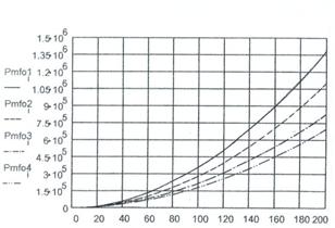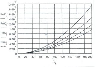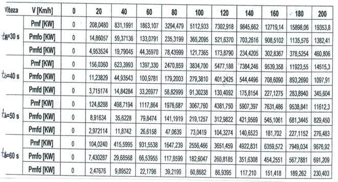 Valorile calculate se prezinta in tabelul 5 iar cu ajutorul acestora in figurile 26, 27, 28 s-au prezentat variatia puterii de franare a trenului de mare viteza (Pmf-puterea de franare totala, Pmfo-puterea de franare pe osie, Pmfd - puterea de franare pe disc) in functie de viteza, pentru diferite durate de franare (tb =30; 40; 50; 60 secunde).