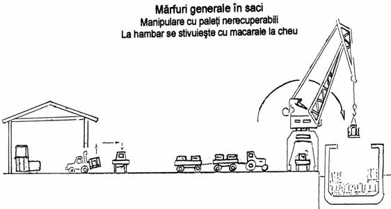 Incarcarea si stivuirea sacilor. Spre deosebire de marfurile in vrac sacii trebuie manipulati bucata cu bucata. Stivuirea sacilor in magazie se poate face in trei moduri, functie de felul marfii continuta in saci: