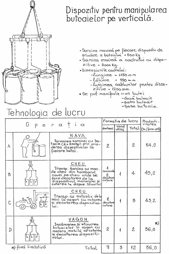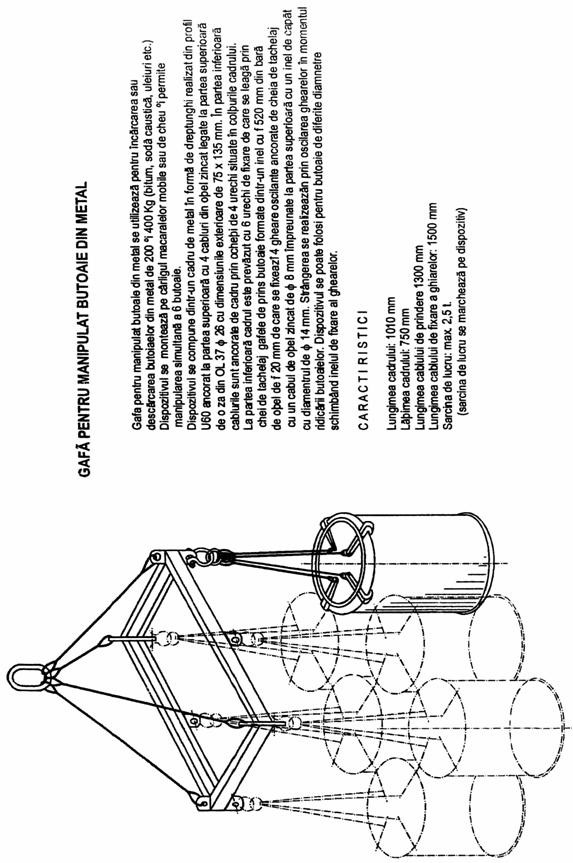 In figurile de mai jos este prezentat dispozitivul pentru manipularea butoaielor pe verticala precum si gafa pentru manipulat butoaie din metal.
