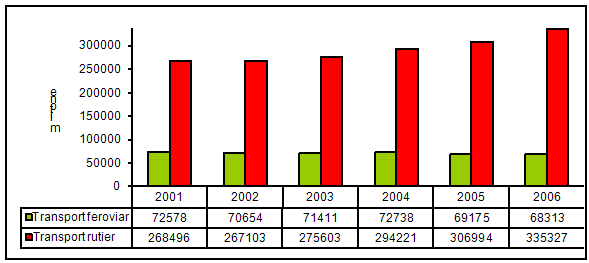 In perioada 2001 - 2006, parcursul marfurilor transportate pe calea ferata, exprimat in milioane tone-km, a scazut pentru transportul feroviar de la 16.102 la 15.791 si a crescut pentru transportul rutier de la 18544 la 57278. asa cum este reprezentat in figura nr. 14.2.5.