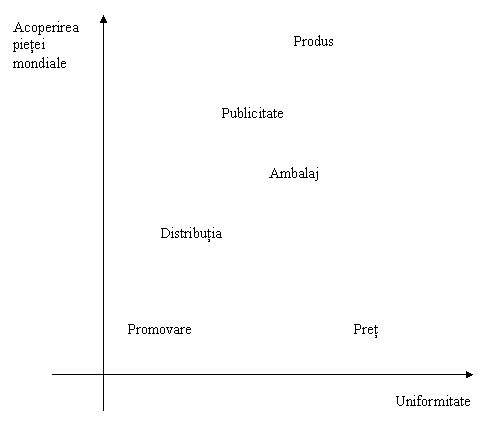Intreprinderea trebuie sa gaseasca economii de scara prin glisarea componentelor de marketing (produs, publicitate, ambalaj, distributie, promovare, pret), intr-un sistem de axe perpendiculare, care pe abscisa reprezinta procentul de acoperire si pe ordonata procentul de uniformitate, ca in figura de mai jos. Aceasta reprezentare permite sa se actioneze pe unul sau altul din factori pentru a pozitiona o familie de produse.