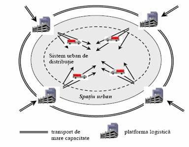 Exista numeroase probleme generate de transportul marfurilor in zonele urbane, cum ar fi congestia traficului, efectele negative asupra mediului, consumul ridicat de energie. Deseori, pentru a satisface cererile beneficiarilor, autovehiculele transporta cantitati de marfa mai mici decat capacitatea lor. O solutie pentru ameliorarea acestor probleme ar fi construirea unor platforme logistice, in vecinatatea punctelor de legatura intre rutele de transport magistral si rutele de transport urban. Efectele construirii unei platforme logistice ar trebui evaluate utilizand indicatori care tin seama de costul de transport, congestia traficului, efectele asupra mediului. Conceptul de platforma logistica incearca sa reduca costurile sociale generate de transportul de marfuri prin promovarea unor sisteme logistice eficiente, atat pentru firme, cat si pentru societate. Amplasarea platformelor logistice se face, in general, in punctele de legatura dintre transportul magistral de mare capacitate si sistemul de transport urban (figura nr.10). Rezultatele utilizarii unui astfel de sistem cu platforme logistice sunt reducerea numarului de vehicule necesare pentru oferirea unor servicii cel putin la acelasi nivel calitativ, sporirea coeficientului de utilizare a capacitatii de transport a vehiculelor, reducerea parcursului vehiculelor, atat in stare incarcata, cat si in stare goala.
