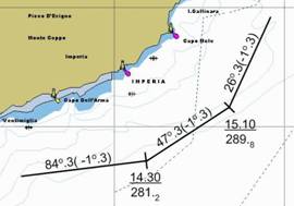 c)Pe harta se inscriu pe segmentele de DA trasate, valorile de drum la compasul dupa care se tine navigatia, iar in paranteze se trec corectia compasului si unghiul a de deriva de vant, cu semnul sau algebric.