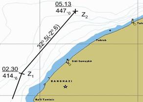 se masoara cu gheara compas valoarea distantei dintre Z1 si Z2; aceasta reprezinta spatiul real (m)pe care nava il va parcurge; (de exemplu, m=324 Mm); se calculeaza in continuare 02 si Cl2 (valoarea vitezei se citeste la loch, Vl=12.3 nd);