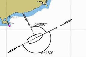 <q<180 - mareste viteza navei (fata de Vrot), si modifica directia de deplasare a navei.