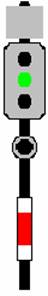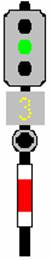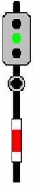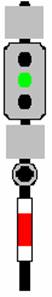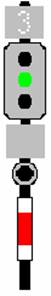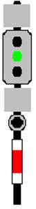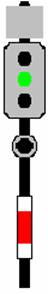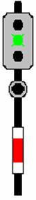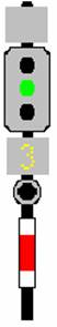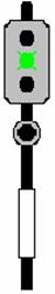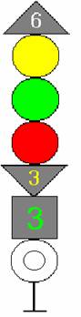 Fig. 5.15 Liber cu viteza stabilita. Semnalul urmator indica liber cu viteza redusa prevestita de catre indicatorul luminos prevestitor de viteza - 2, 3, 6, 8, 10. In figura, 3 inseamna 30 km/h.