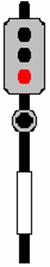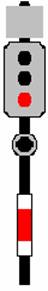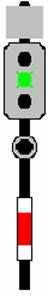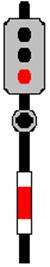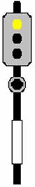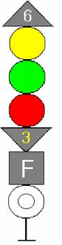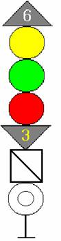 Fig. 5.20 Liber cu viteza stabilita. Semnalul urmator indica liber cu viteza redusa prevestita de catre indicatorul luminos prevestitor de viteza - 2, 3, 6, 8, 10. In figura, 3 inseamna 30 km/h.