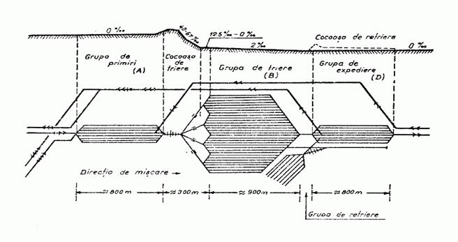 Pentru primirea trenurilor de marfa,descompunerea lor,formarea de noi trenuri si expedierea acestora,liniile unui triaj sunt impartite pe grupe astfel: