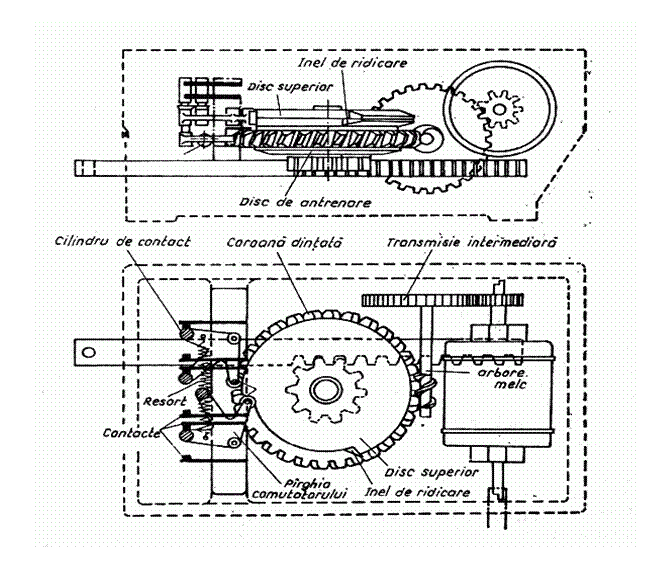 -transmisia mecanica, prin care se transforma miscarea de rotatie a electromotorului in miscare de translatie a barei de manevrare a acelor.