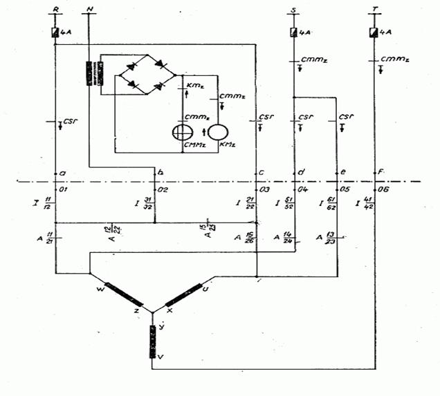 In aceasta pozitie a macazului releulKMz este excitat,iar releele CMMz si CSR sunt dezexcitate.Prin contactele releului CmmZ fazele S si T sunt intrerupte,iar legatura intre faza R si W este si ea intrerupta la contactul A 11/21.Releul KMz este excitat deoarece prin infasurarea primara a transformatorului trece curent,circuitul dintre R si N inchizandu-se prin firele 01 si02(contactul A12/22 stabilit).Daca in aceasta situatie se excita releele CMMz si CSR cele trei faze se conecteaza la bornele u,v,w ale motorului,manevrand macazul de la dreapta spre stanga,astfel:faza R se conecteaza la borna u prin conductorul 03,faza S la borna W prin 04 si faza T la borna V prin 06.In timpul manevrarii macazului contactele A12/22 si A15/25 sunt intrerupte,astfel ca prin infasurarea primara a transformatorului nu trece curent,deci nici unul din cele doua relee alimentate prin puntea redresoare nu ar putea fi excitat.Pe langa aceasta circuitul releului KMz mai este intrerupt si prin contactul releului CMMz,care este dezexcitat.Releul CMMz are un singur contact de autointrerupere care se stabileste in momentul excitarii sale si ramane stabilit tot timpul cat armatura este atrasa.Ca urmare a dezexcitarii releului CMMz si a intreruperii contactului A11/21,releul csr fiind dezexcitat,motorul se opreste,alimentarea sa prin cele trei faze fiind astfel intrerupta.Pe langa aceasta se excita si releul KMz,indicand pozitia finala ,cu control,a macazului.Cand macazul se afla in pozitie finala,cu control si da acces spre stanga,comutatorul automat stabileste contactele A11/21,A13/23 si A15/25 si intrerupe contactele A12/22,A14/24 si A16/26.In aceasta situatie releele CSR si KMz sunt excitate,iar releul CMMz dezexcitat.Pentru a manevra macazul de la stanga spre dreapta releul CMMz trebuie excitat,iar CSR trebuie dezexcitat.Ca urmare faza R se conecteaza la borna W prin conductorul 01 si contactele csr,I11/21 si A11/21,faza S la borna U prin 05 si contactele CMMz,CSR,I61/62 si A13/23,iar faza T la borna V prin 06 si contactul I41/42