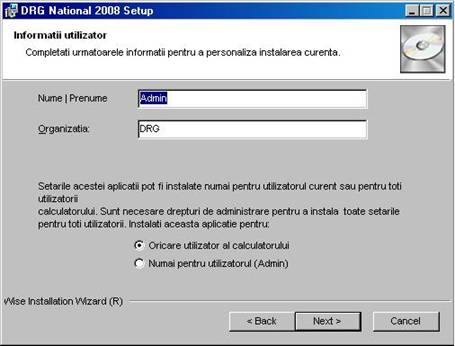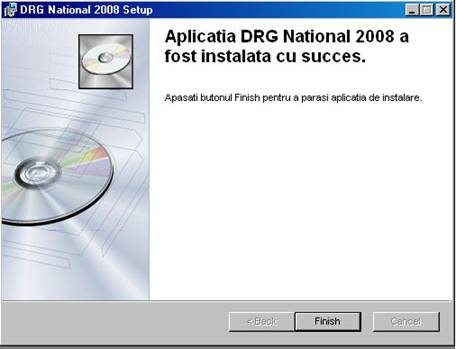 Pentru instalarea aplicatiei se descarca kitul de instalare disponibil in pagina www.drg.ro, in sectiunea Spitalizare Continua, si se ruleaza fisierul DRGNational2008.msi. In cazuri speciale spitalele vor fi anuntate cu privire la modalitati de actualizare a aplicatiei.