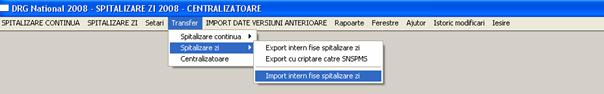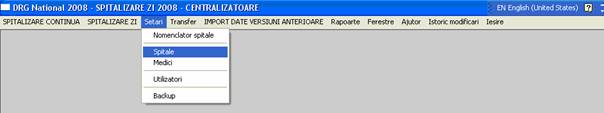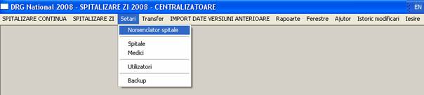Din meniul aplicatiei se alege <<Setari/Nomenclator spitale>> si va apare macheta <<Gestiune nomenclator spitale>>. Operatia este permisa numai pentru utilizatorul "drgadmin".