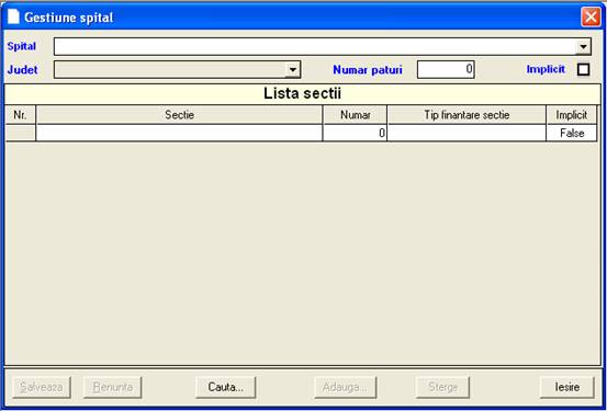 1. Daca se opteaza pentru completarea informatiilor despre un spital nou, utilizatorul va completa informatiile despre spital si sectiile existente in cadrul acestuia. Pe masura ce se completeaza date butonul Cauta devine inactiv. Aceasta pentru a obliga utilizatorul sa decida in privinta datelor introduse: salveaza datele in baza de date, daca acest lucru este posibil (butonul Salveaza), sau renunta la operatia curenta (butonul Renunta)