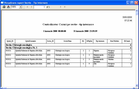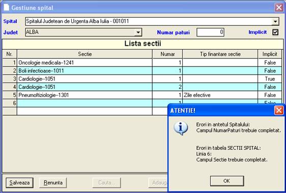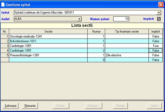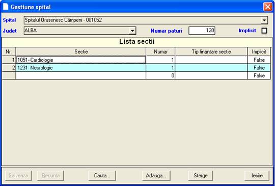 Selectand spitalul dorit si efectuand un dublu-click cu mouse-ul pe spitalul dorit se obtine incarcarea datelor in macheta principala, inclusiv datele despre sectiile configurate: