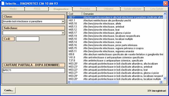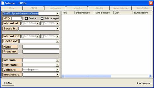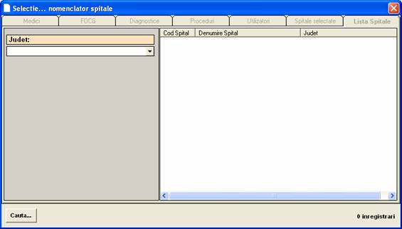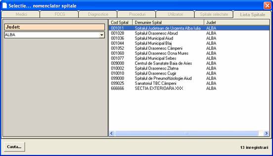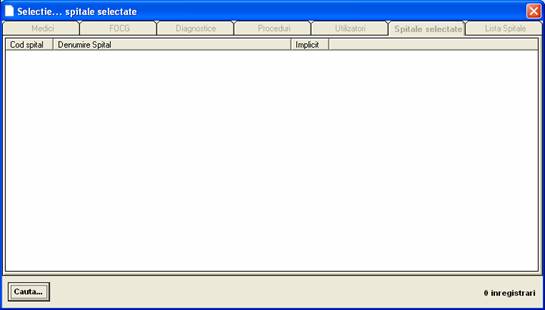 Pentru afisarea informatiilor disponibile in aceasta fereastra se utilizeaza butonul Cauta, stanga, jos, care va afisa informatii despre spitalele salvate anterior in baza de date a aplicatiei. De precizat ca se pot afisa toate spitalele, sau numai cele din judetul selectat in filtrul disponibil in partea stanga a machetei de selectie.
