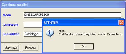 Urmatoarele informatii sunt obligatorii: Nume medic, Cod Parafa si Specialitate.