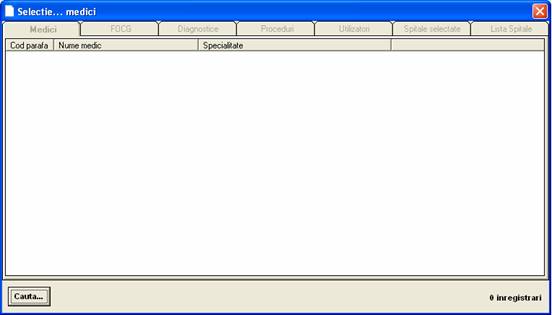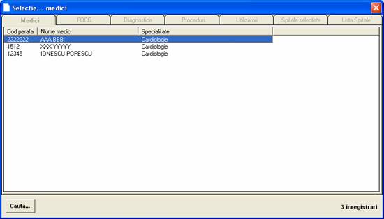 Pentru afisarea informatiilor disponibile in aceasta fereastra se utilizeaza butonul Cauta, stanga, jos, care va afisa informatii despre medicii disponibili in baza de date a aplicatiei: