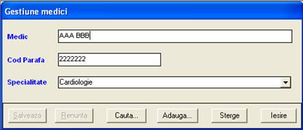 Din meniul aplicatiei se alege <<Setari/Medici>> si va apare macheta <<Gestiune medici>>. Operatia este permisa numai pentru utilizatorul "drgadmin".