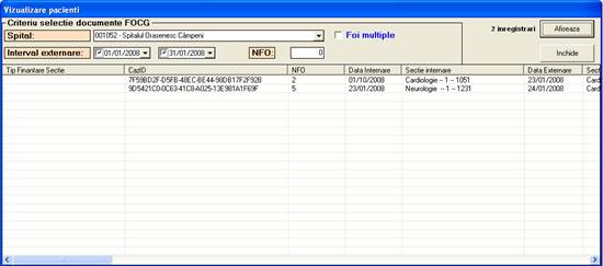 Vizualizare pacienti - permite definirea unui unui criteriu si afisarea informatiilor specifice acestui tip de spitalizare, cat si exportul datelor intr-un format compatibil Microsoft Excel. Datele listate sunt asociate tuturor tabelelor care stocheaza informatii specifice acestui tip de spitalizare.