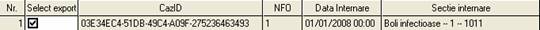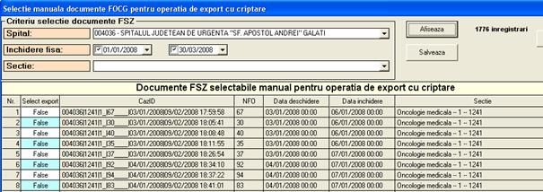 Butonul Afiseaza listeaza documentele FSZ care se vor exporta. In scopul accelerarii afisarii informatiilor, numai coloanele semnificative din documentul FSZ sunt afisate: CazID, NFO, DataDeschidereFisa, DataInchidereFisa, SectieExternare: