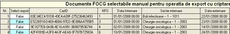 Odata afisate aceste inregistrari prin intermediul butonului "Afiseaza" coloana Select export este activa, afisand informatii despre flagul "Selectat pentru export" de tipul True, pentru foile care sunt marcate deja pentru aceasta operatie si False, pentru potentialele documente FSZ selectabile manual pentru export.