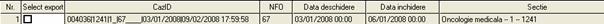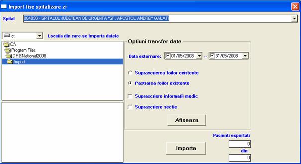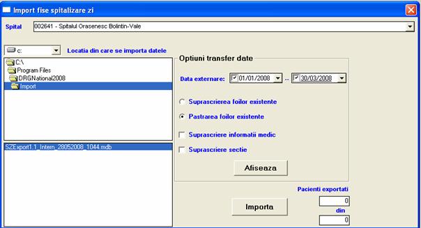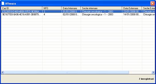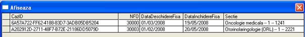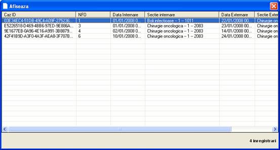 Butonul Afiseaza listeaza documentele FSZ care se vor importa. In scopul accelerarii afisarii informatiilor, numai coloanele semnificative din documentul FSZ sunt afisate: CazID, NFO, DataDeschidereFisa, DataInchidereFisa, SectieExternare: