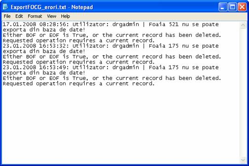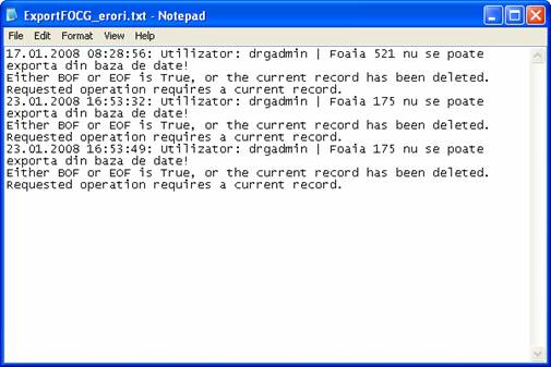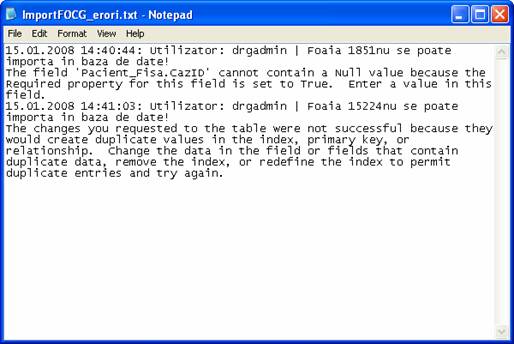 Odata incheiata detalierea procedurii de transfer a datelor despre nomenclatoare, incepe procesul de export date propriu-zis. Metoda aleasa pentru aceasta operatie este una de tip "Foaie cu Foaie". Aceasta deoarece preactic, in baza de date a aplicatiei DRG National se pot transfera prin alte mijloace date provenind din bazele de date ale altor furnizori de aplicatii la nivelul spitalului. Metoda garanteaza continuarea exportului, imediat dupa aparitia unui document FSZ care nu poate fi exportat. In aceasta din urma situatie, un mesaj continand textul erorii este scris in fisierul "ExportFSZ_erori.txt" din directorul Log al aplicatiei: