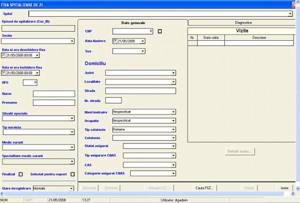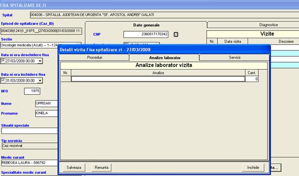 Fisa spitalizare zi - permite introducerea, editarea si stergerea informatiilor privind cazurile de spitalizare de zi, intr-un mod identic celui de la spitalizarea continua. In ceea ce priveste procedurile, serviciile, si analizele de laborator efectuate, acestea se colecteaza prin selectarea unei vizite si acesarea butonului Detalii Vizita.