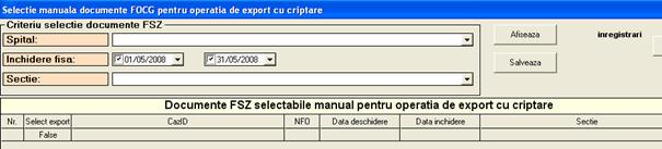 Selectie manuala Fise pacient pentru export - meniul <Operatii FSZ/Selectie manuala export>: este posibila astfel selectarea unor documente FSZ care indeplinesc criteriul de selectie specificat pentru operatia de selectare manuala in vederea exportului din baza de date.
