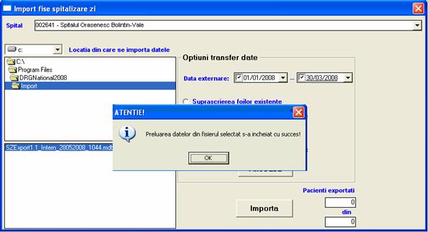 De remarcat ca in prtea dreapta jos a interfetei este afisat numarul pacientilor exportati. Daca cele doua cifre nu coincid este necesara consultarea fisierului "ExportFSZ_erori.txt" din directorul Log al aplicatiei.