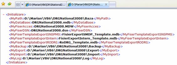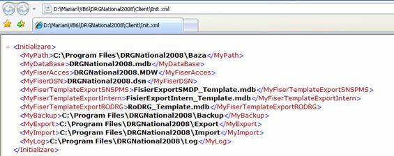 Pentru a se realiza accesul la baza de date, aplicatia DRG National utilizeaza o serie de setari configurate in fisierul Init.xml. Implicit acesta are configurate valori specifice unei instalari in directorul C:Program FilesDRGNational2008.