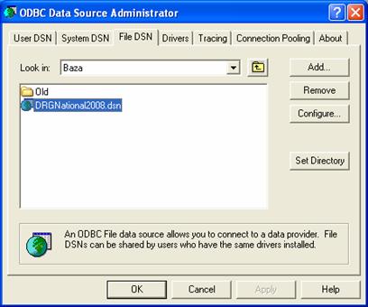 Implicit, si fisierul DrgNational2008.dsn a fost configurat pentru a utiliza setarile locale si conforme instalarii aplicatiei in calea "C:Program FilesDRGNational2008". Daca aplicatia se instaleaza in alta locatie sau se utilizeaza in retea, este necesara de asemenea reconfigurarea acestui fisier. Pentru reconfigurarea acestuia pentru lucrul in retea consultati Anexa 5.4.