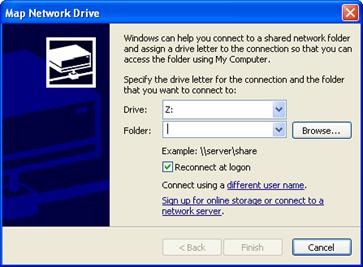 Se realizeaza operatia Map Network Drive, disponibila in meniul Tools din Windows Explorer. Este afisata fereastra de mai jos: