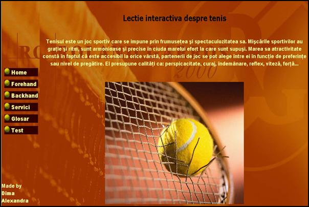 'Lectie interactiva despre tenis" este o aplicatie web ce vine in ajutorul institutiilor de invatamant care doresc sa ii invete pe elevi despre acest sport "alb" numit tenis.