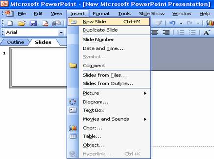 mult de un slide de titlu, va trebui selectat Insert, New Slide sau se va apasa Ctrl+M. PowerPoint va adauga la prezentare marcajul unui nou slide.