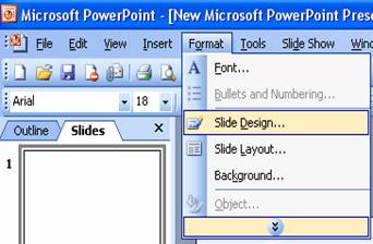 se alege Format, Slide Design. PowerPoint afiseaza miniaturile mai multor template-uri de design in partea din dreapta a ecranului.