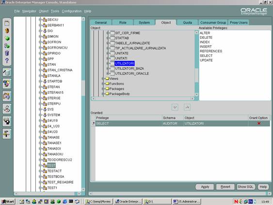 O varianta alternativa de grantare a unui privilegiu este folosirea utilitarului Oracle Entreprise Manager: