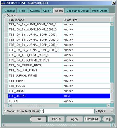 In figura 2 este prezentat un exemplu in care pentru utilizatorul TEST se modifica la 10Mb cota alocata pentru spatiul-tabel TBS_USERS.