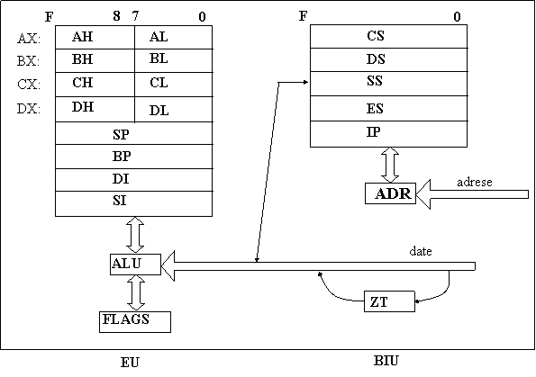 Aceasta structura poate fi vazuta in figura 2. Microprocesorul dispune de mai multi registri generali pe 16 biti. El este format din doua componente mari: