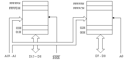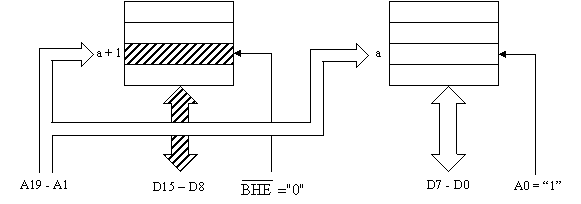 Daca se doreste accesul la un operand octet aflat la o adresa impara, a + 1 in figura 9, linia A0 va invalida blocul par in timp ce BHE = "0" logic va selecta blocul impar. Ca urmare va avea loc transferul intre locatia adresata si jumatatea superioara a magistralei de date.