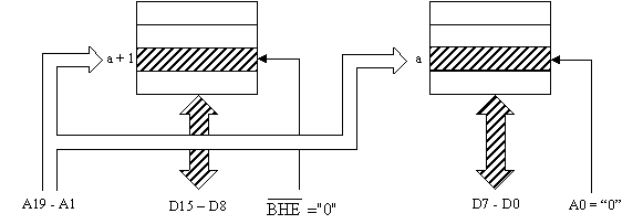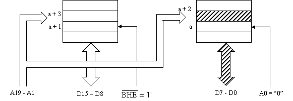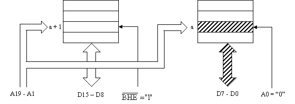 Pentru accesul la un operand aflat la o adresa para, linia A0 va selecta blocul par, iar linia BHE va invalida blocul impar. Ca urmare va avea loc transferul intre locatia adresata si jumatatea inferioara a magistralei de date. Fig. 8 prezinta acest transfer unde "a" este adresa para a opernadului octet.
