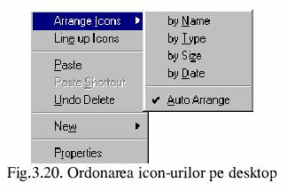 Pozitionand cursorul mouse-ului oriunde pe desktop (nu pe un obiect de pe desktop ci pe o portiune libera de desktop) si efectuand un click cu butonul din dreapta este afisat un meniu similar cu cel din figura 3-19 :