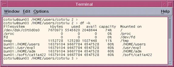 df -k afiseaza informatiile in kbytes. Fiecare linie consta intr-o informatie pentru fiecare sistem de fisiere. Aceste informatii includ numele sistemului de fisiere, spatiul total alocat sistemului de fisiere, suma totala a spatiului alocat fisierelor existente, suma totala a spatiului disponibil pentru crearea unor noi fisiere si procentul care este in mod normal alocat tuturor fisierelor din sistemul de fisiere.