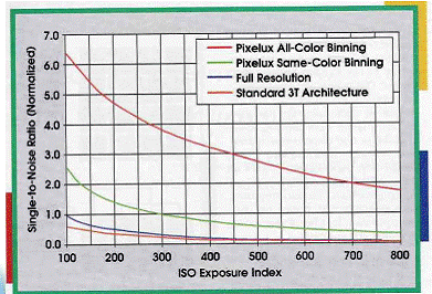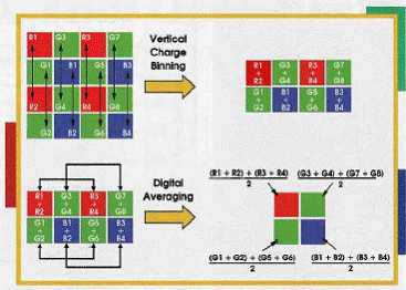 Pixelii din vecini a aceleiasi culori pot fi combinati prin selectarea incarcarilor, urmata de medierea orizontala. Acesta ofera imagine cu rezolutie redusa dar cu capabilitate ridicata in mediile cu luminozitate redusa.