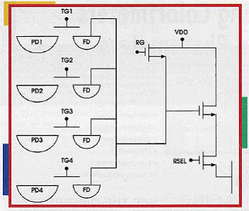 In arhitectura 4T4S, un grup de patru pixeli impart 7 tranzistori si un singur amplificatory, TG= poarta de transfer; VDD= tensiunea de alimentare a amplificatorului; FD= difuziunea flotanta, PD= fotodioda, RG= poarta de reset; RSEL= intrarile de selectare a randului